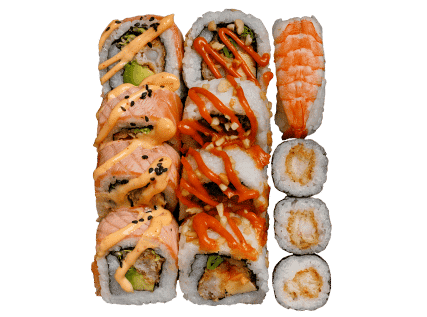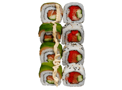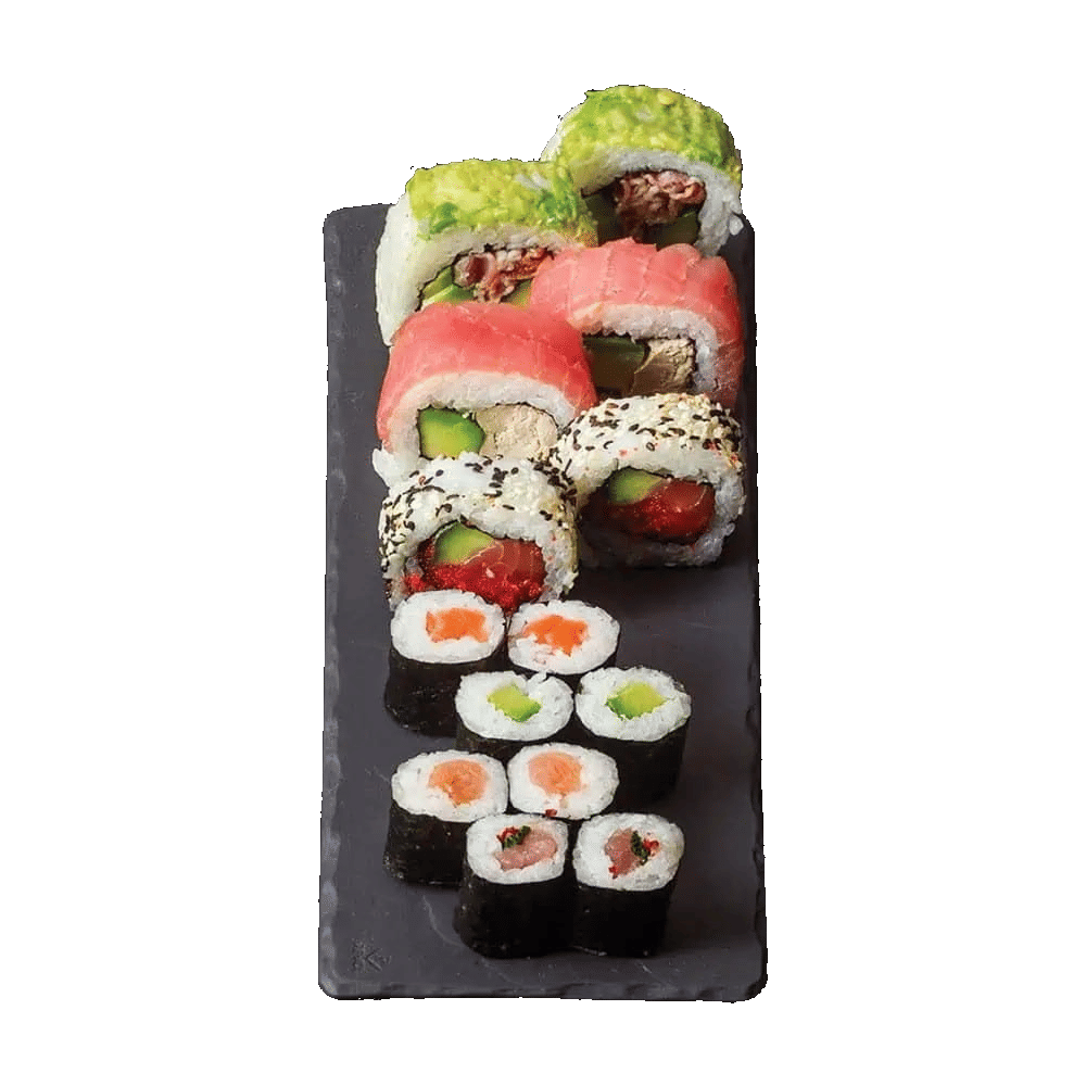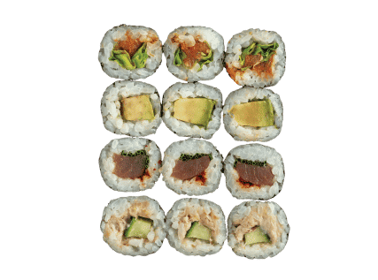 2 lazac maki, 2 japán omlett maki, 2 spárga maki, 2 uborka maki, 2 füstölt lazac-rukkola maki, 2 lazackaviár maki, 2 ropogós rák maki, 2 kacsamáj maki